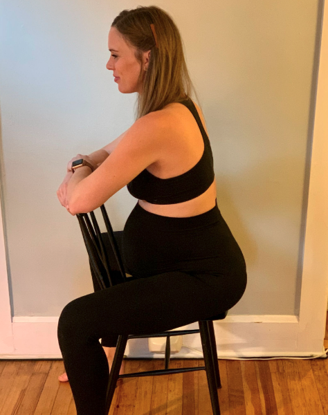 Try sitting backward on a chair (arms resting on the back of it) to gently encourage forward-leaning posture. This one may not be ideal if you have pelvic pain, so listen to your body.